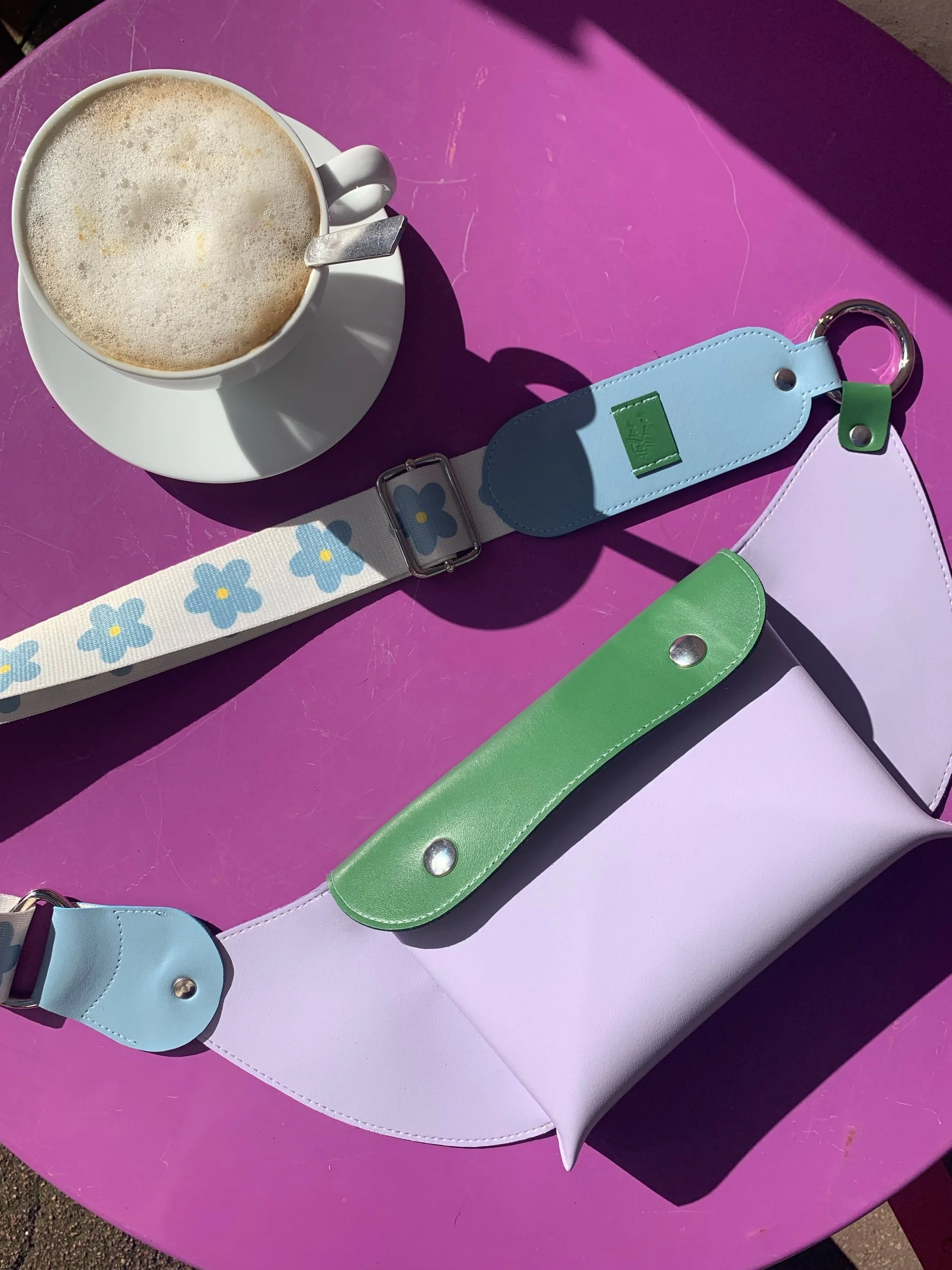 Cuirs de pommes lavande, gazon et ciel (60% recyclé). Sangle blanche à fleurs bleues. Boucle en laiton nickel, vintage. Fermoirs magnétiques, anneau mousqueton et rivets en laiton, coloris nickel, fabriqués en Italie. Teinture de tranche Made in France à base d'eau.